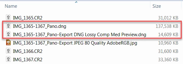 This is what I love about participating in the Adobe forums–I almost always learn something! I woke up this morning and had a DUH moment. You CAN reduce the size of the LR panorama DNG using the Export module and selecting DNG Image Format and 'Use Lossy Compression.' Yes it's a lossy file format, but unlike JPEG file format it contains the original raw data. I tried this on a few panorama DNGs and couldn't any difference at 1:1 Zoom View between the original DNG and Lossy DNG files.