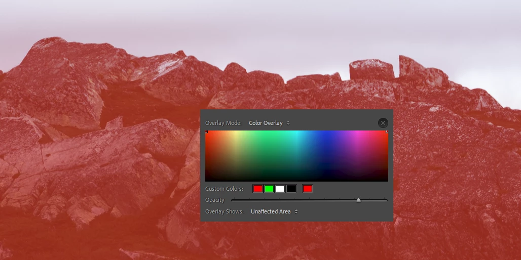 Setting the color overlay to show the unaffected area tells a different story, it indicates (wrongly) that the landscape is unselected, as well as lower parts of the sky.