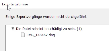 This happens arbitrarily for sveral images imported in the past, that could be exported without problems by the previous release. Since the DNG-Files can be opened externally without problem and can be reimported and the error dissapears, I suspect a bug or instability with the with the enhanced for new features of the DNG component reading older legacy DNGs.