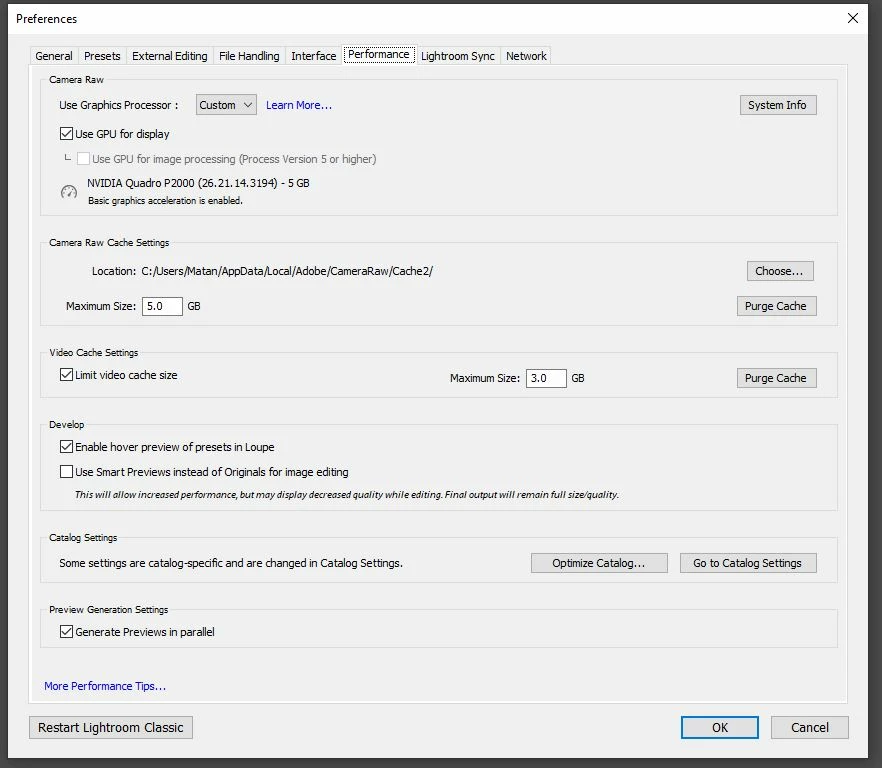 Yet when I go to the Performance tab, choose "Custom" for "Use Graphics processor", I cannot check the "Use GPU for image processing" option. It is greyed out.