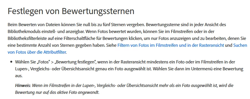 Hallo, ich habe folgendes Problem: wenn ich im Bibliotheksmodus in Lightroom z.B. drei Bilder auswähle mit "N" und einem davon einen Stern geben möchte, dann bekommen bei mir alle Fotos denselben Stern als Bewertung. Das gewünschet Foto ist aktiv innerhalb der "N"-Auswahl angewählt. Vor dem letzten Update hatte ich dieses Problem nicht. Laut Adobe-Hilfe sollte die Bewertung immer nur auf das aktive Foto angewandt werden - siehe unten, aber bei mir ist das nicht so.