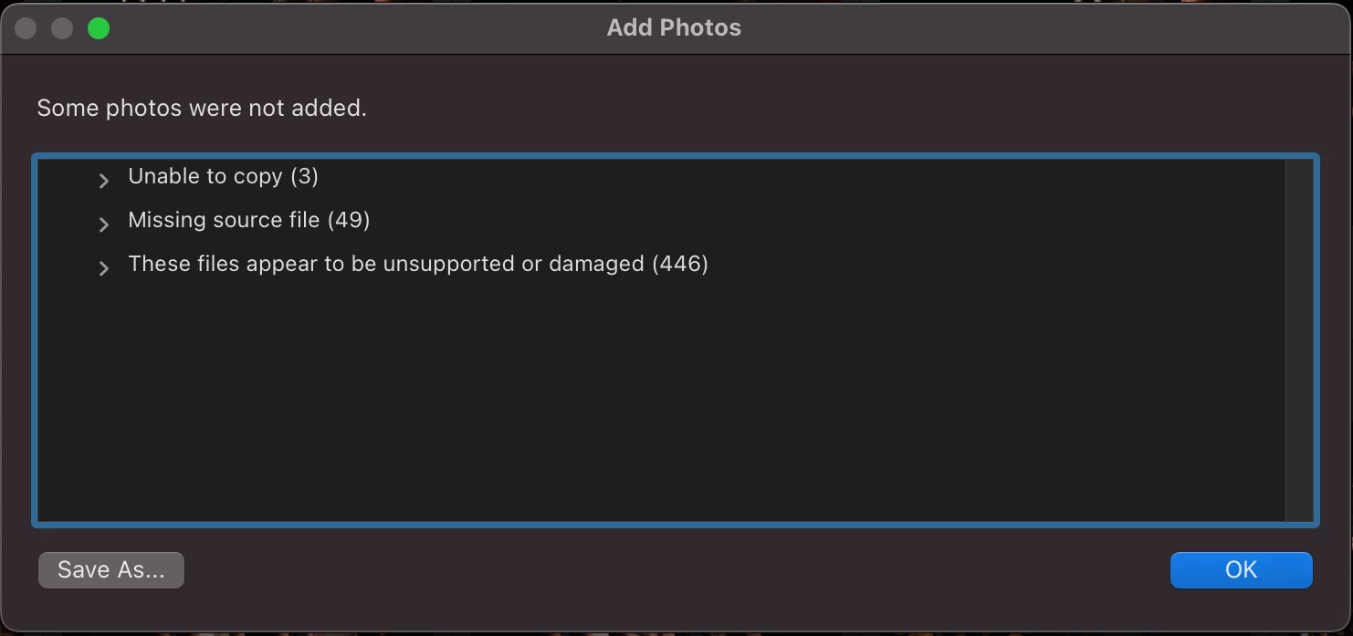 Every time that I try to import photos from the SD card into Lightroom, it does not work anymore. When I select the photos (many have exclamation points), I then press "Review for Import" and "Add Items" and always get a different notification as the import fails.
