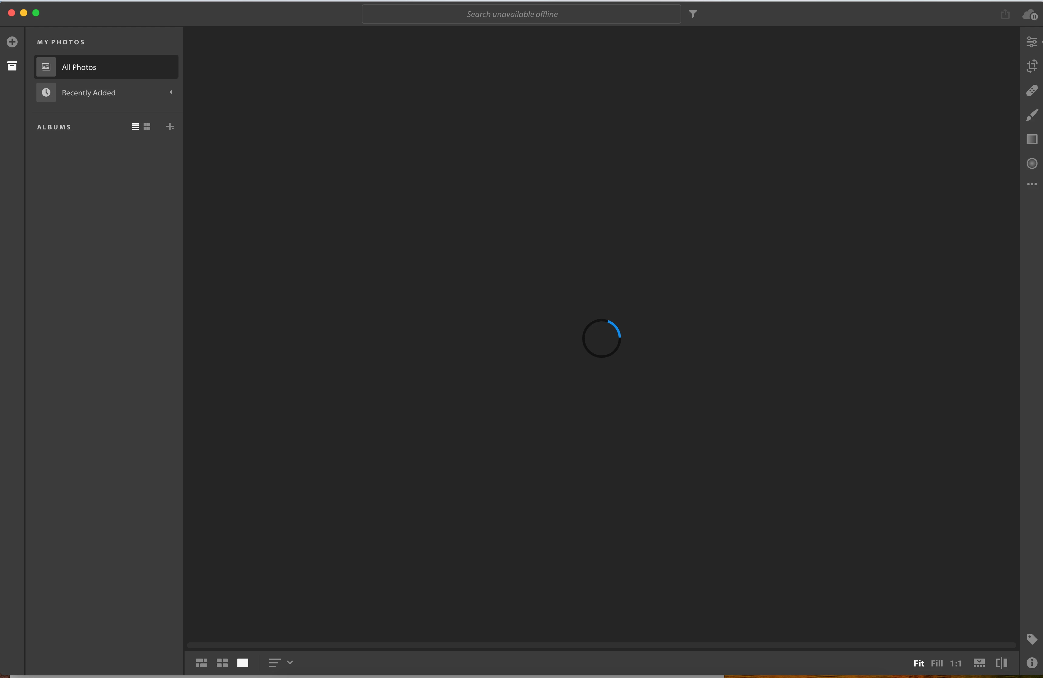 I am having a problem opening Lightroom and loading my photo library. When I open the application, the library does not load and instead a blue circle loops continuously (screenshot below).
