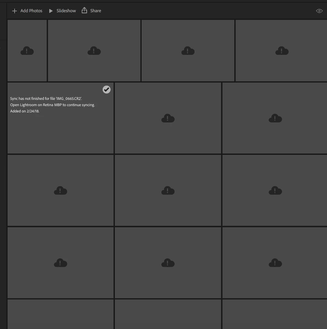 5. Start Lightroom CC. It will sync down your images from the cloud.