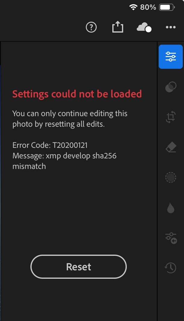 I have run into some unexpected LrM/LrD sync trouble after the recent updates, leading to the below error. I was making some edits on LrM (iPadOS) to Smart Previews synced up from LrC. Everything seemed to generally be going fine. Changes synced across as expected, though some images weren’t always properly changing albums in LrM when moved in LrC. At one point, I switched back to Edit in LrM for a couple of those images. I'd changed Edit settings on them a few minutes prior. I received a "Settings could not be loaded" error. "Error Code: T20200121; Message: xmp develop sha256 mismatch." Screenshot below. Issue was originally for 2, but now 3, images.