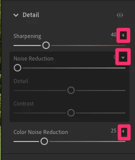 It sounds like you haven't expanded the various options in the Detail panel to show the sub-options. If so, click on the small triangle to the right of Sharpening, Noise Reduction, Color Noise Reduction to show/hide the other sliders.