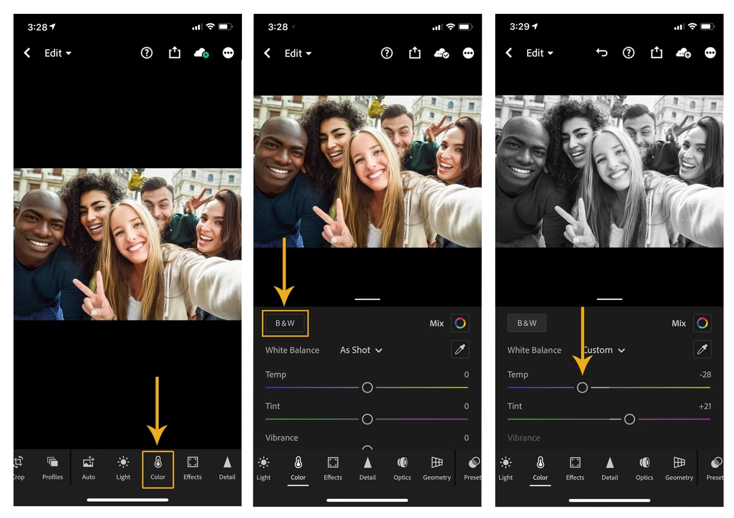 If you use a compatible iOS or Android mobile device, you can use Adobe Lightroom for mobile apps to convert a photo to black and white and easily post it to social media. Adobe Lightroom for mobile on iOS and Android make transforming images to black and white easy with a tap on the B&W button in the color panel. Feel free to get creative and put your own finishing touches on your black and white image by further adjusting the Temp and Tint sliders.
