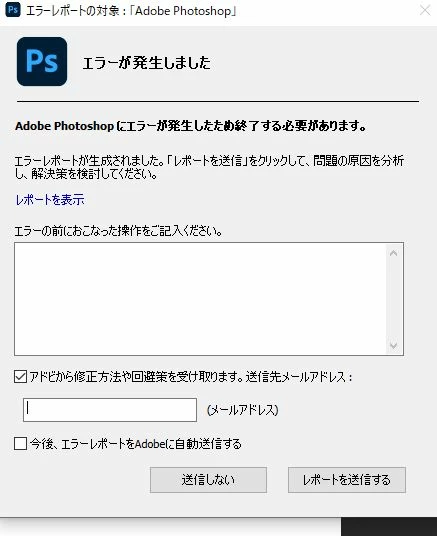WEBバナー画像用のファイルを作成し、保存した.psd ファイルを再度開こうとすると添付メッセージがでて、「送信しない」or「レポートを送信する」を押すと、photoshopが強制終了してしまいます。