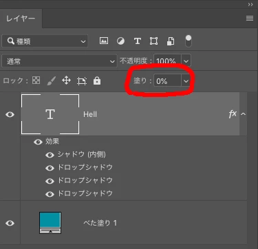 文字レイヤーを作成したら、「塗り」を0%にします。文字の色は見えなくなり、効果だけが見えるかたちとなります。