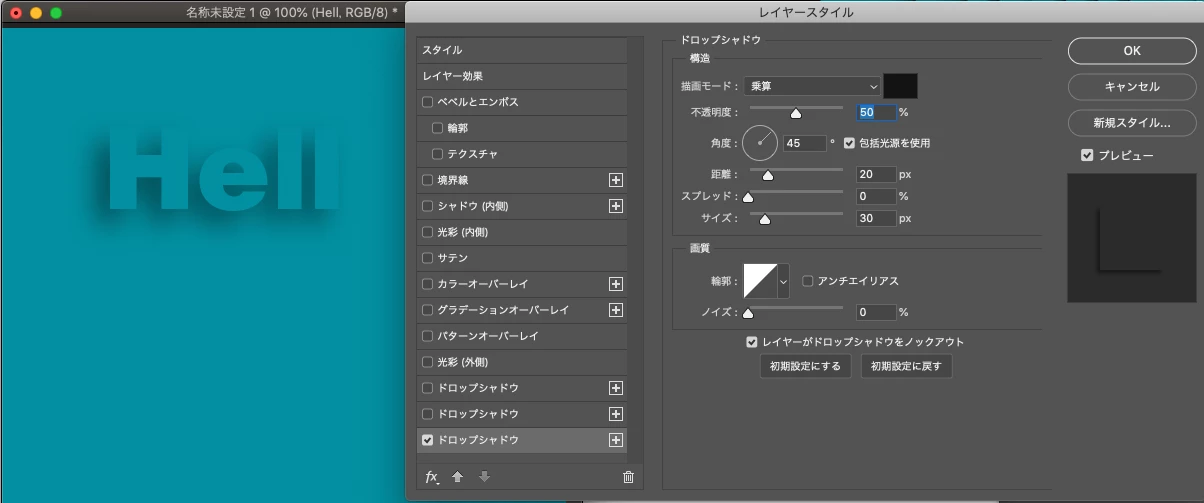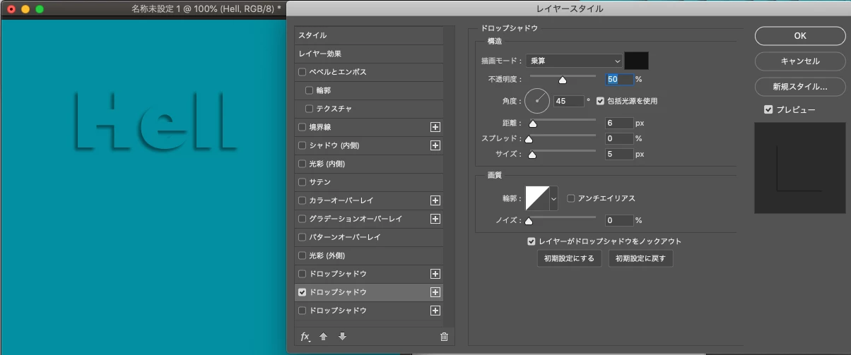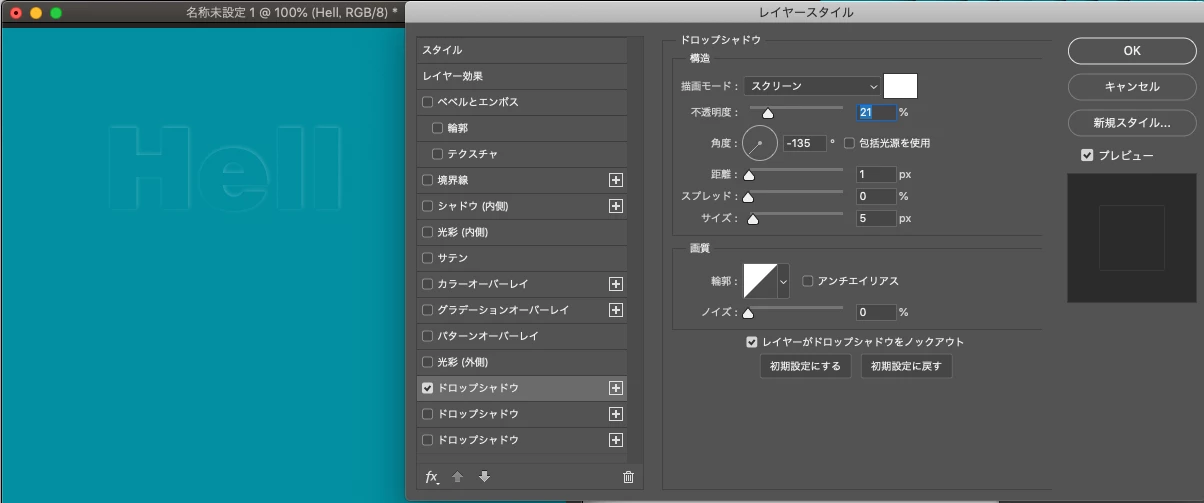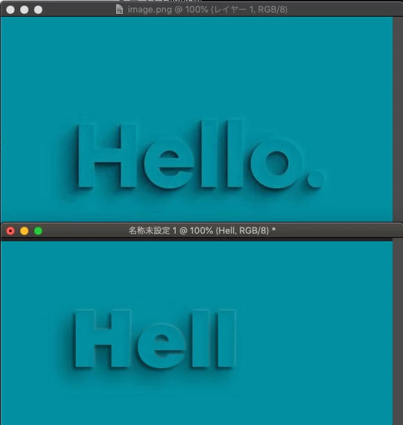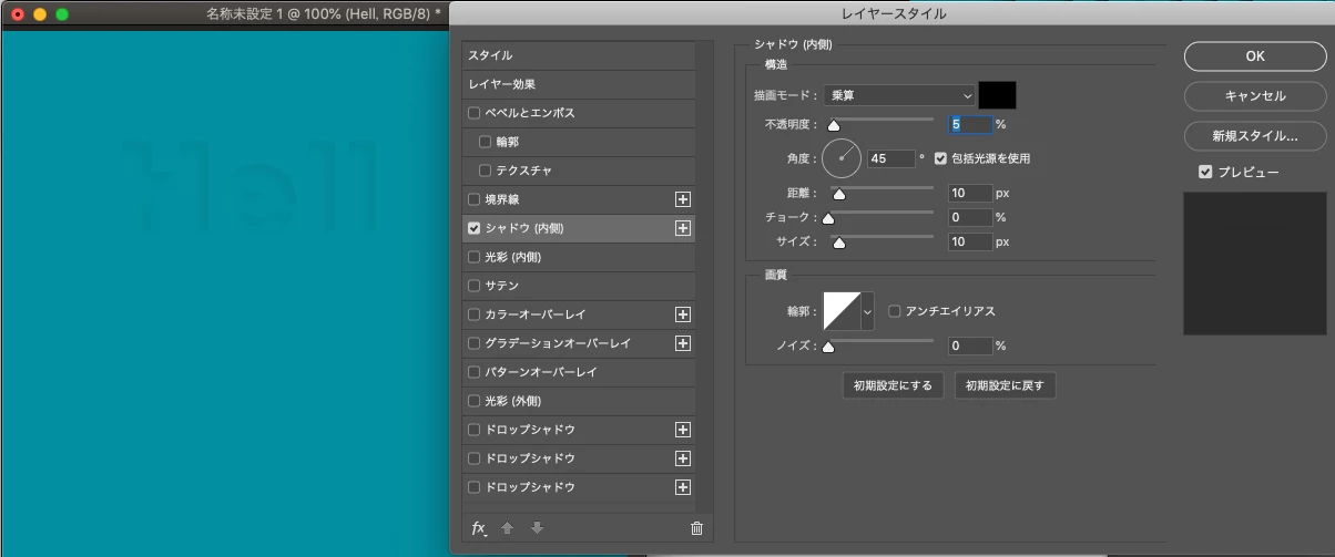 濃い影→薄い影→右上の光→文字面内側の影 の順で作りましたが、順番は関係ありません。