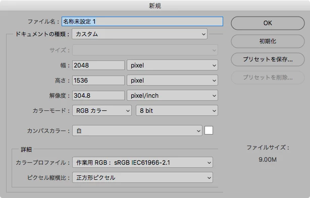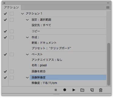 アクションの記録の再に 数字【300】 単位【pixel/inch】を指定したのですが、