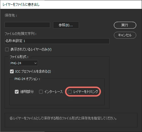 オプションのレイヤーをトリミングのチェックを外せば透過部分もトリミングされません