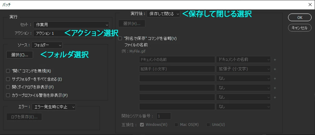 ファイル>自動処理>バッチ処理を選択