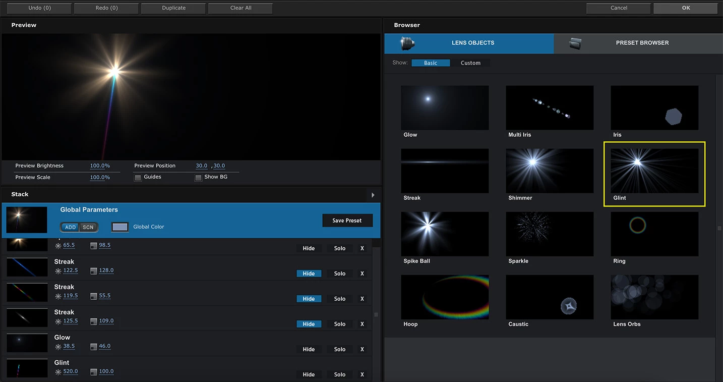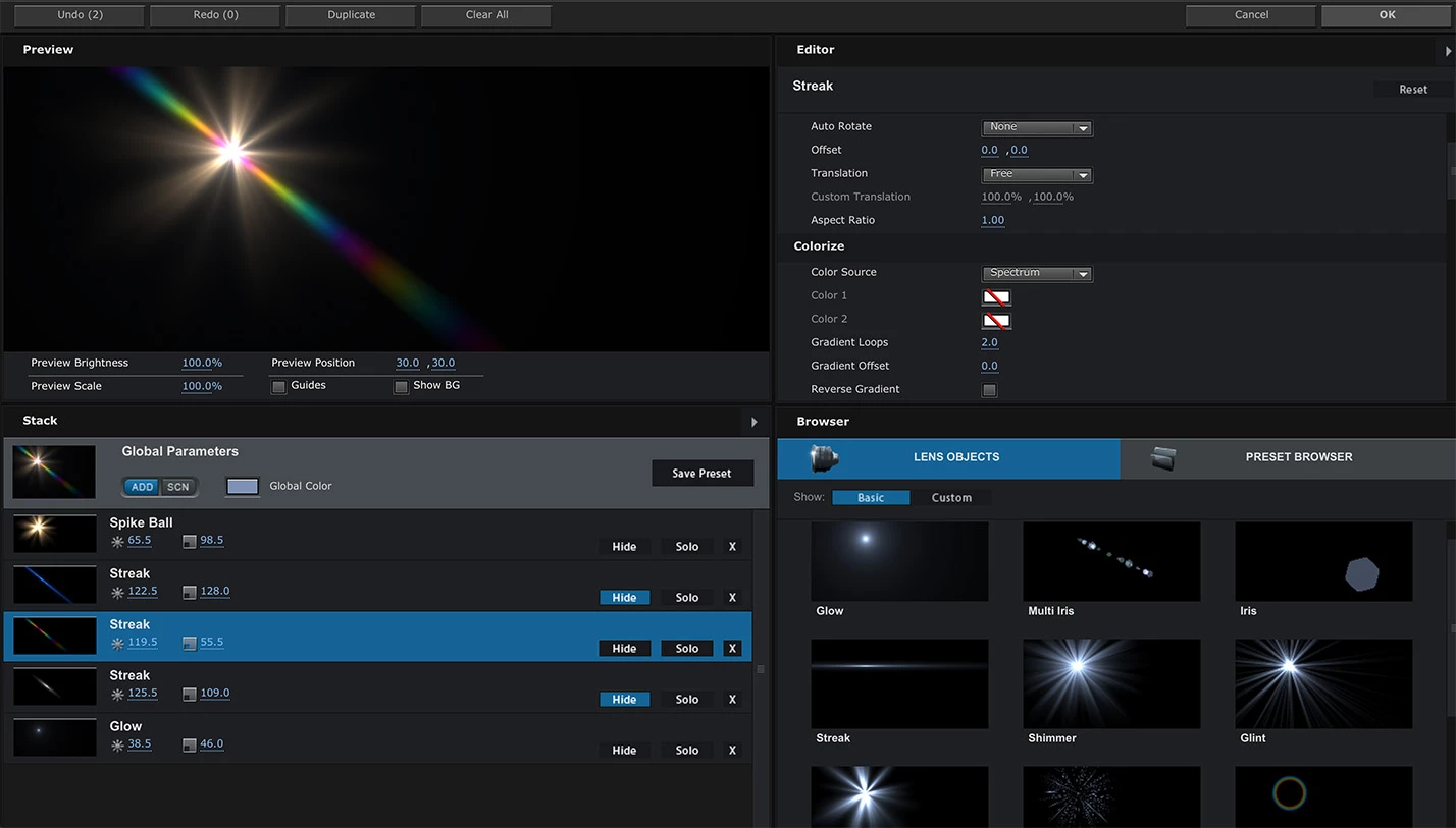 尚、レンズフレアでは、斜めに一本線の光線が出る現象はあまり発生しないためか、プリセットに無いのでカスタマイズは必要になります。