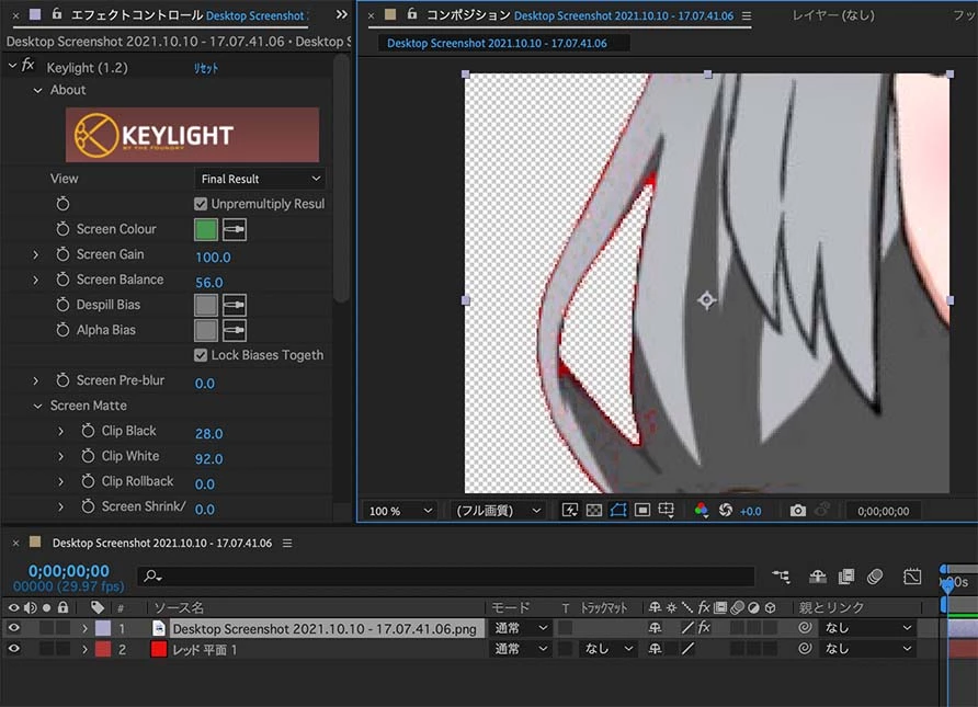 添付の画像をAfter Effects標準搭載のキーイングエフェクト「Keylight」を使って、グリーンの色を抜いたのが下記画像になります。