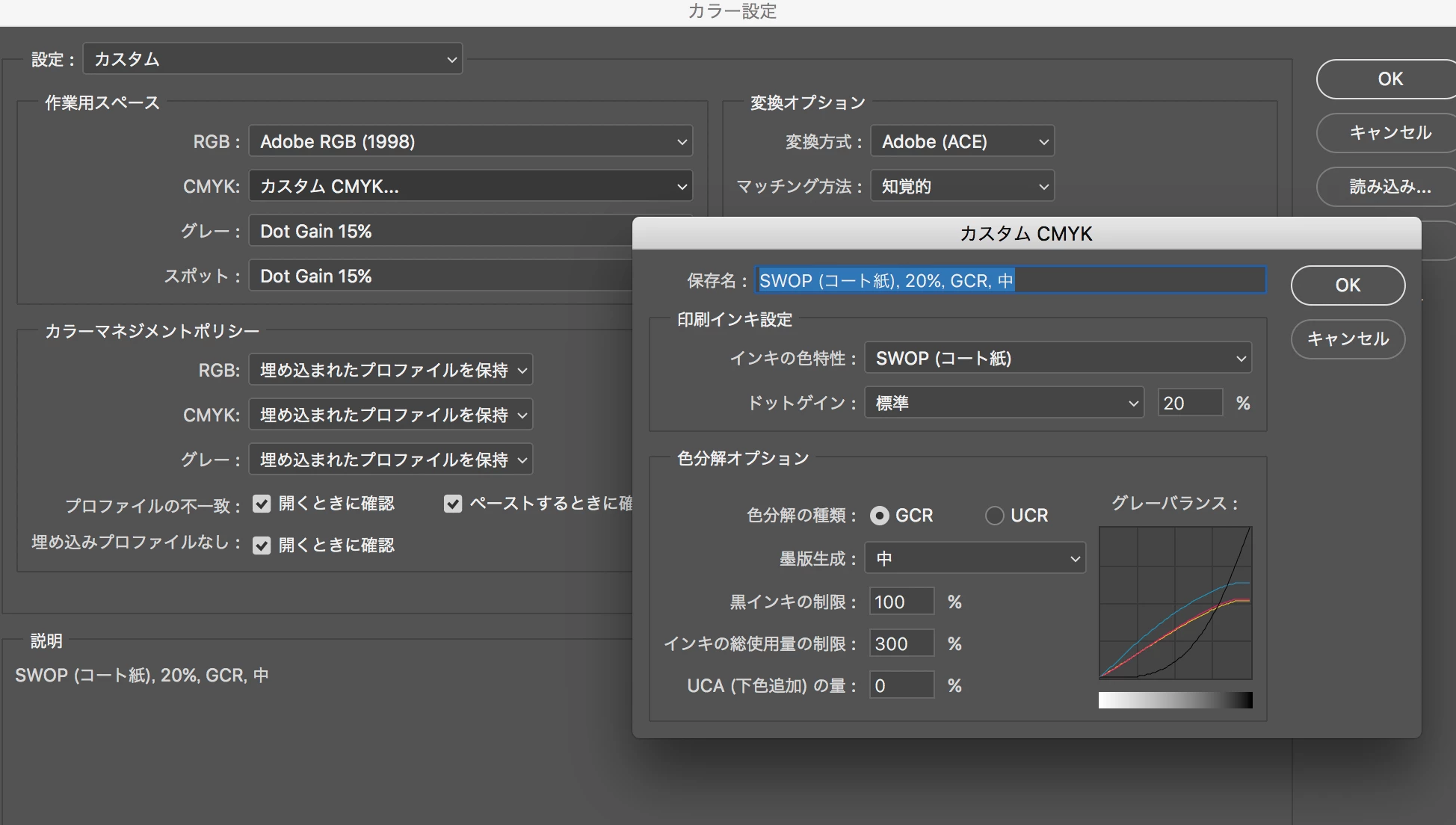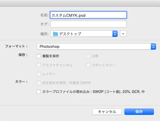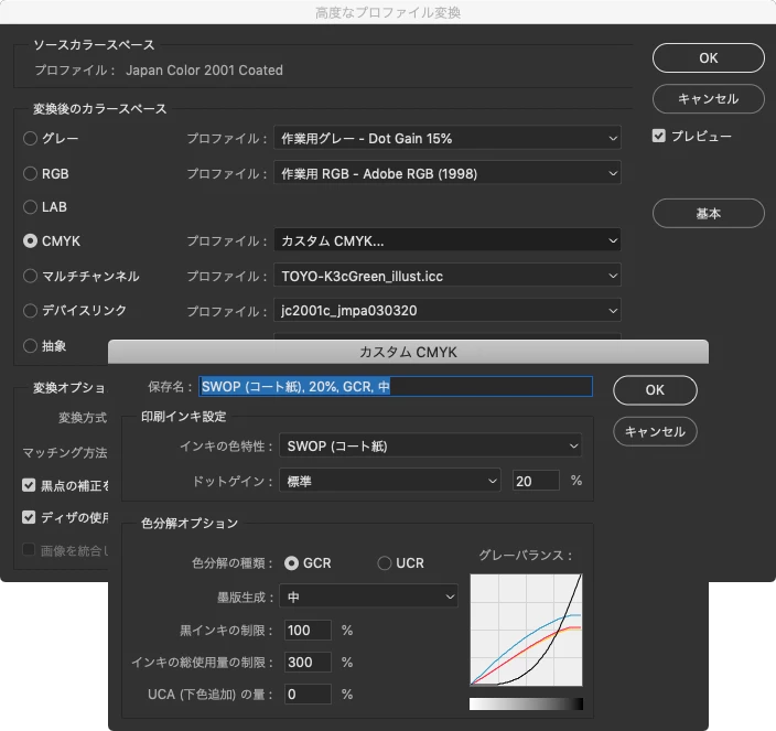 ・カラー設定を印刷向けの「プリプレス用 – 日本2」「Adobe RGB」「Japan color 2001 Coated」にすると上限の300%を超えてしまう