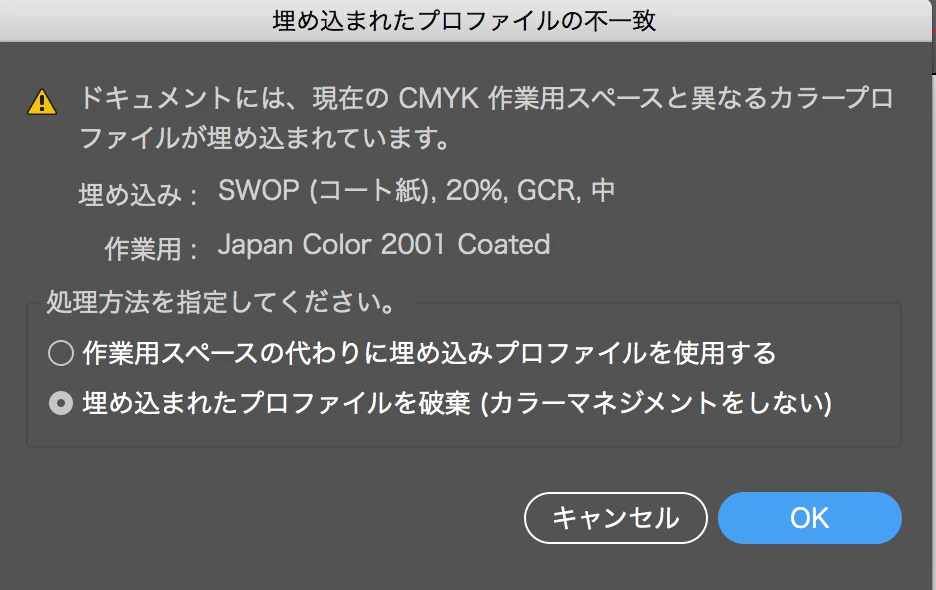 すると配置しているIllustratorではJapan color 2001 Coatedなのに画像はSWOP〜になり、