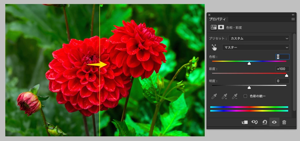 例えばこちら、色相・彩度使うと、背景の低彩度部分は爆上がりしますが、花部分はほとんど変わりません。