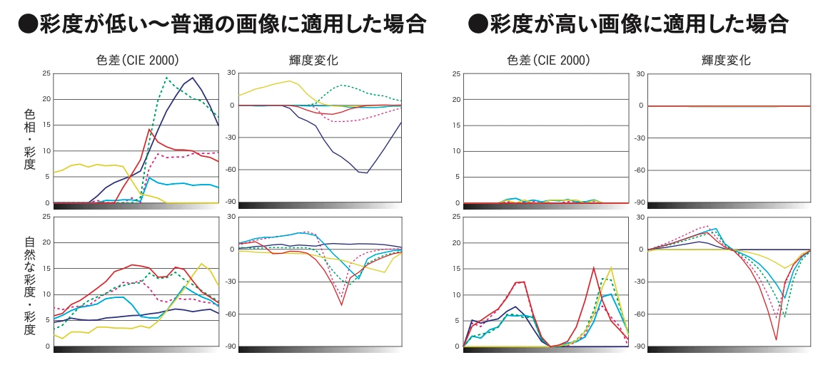 グラフにするとこうなります。鮮やかな画像では、色相・彩度は何も変えませんが、自然なほうの彩度は明るさも無理矢理変えて鮮やかにしようとしていることがわかります。