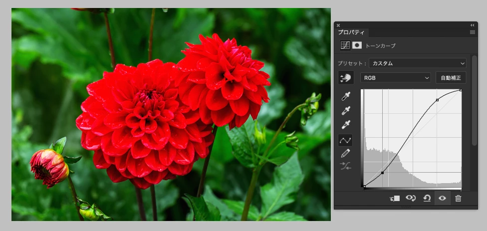 あと彩度は、「色相・彩度」「自然な彩度」のような「彩度」とついている機能だけでなく、トーンカーブで明るさやコントラスト変えるだけでも変わります(ほかの色調補正、例えばレベル補正、明るさ・コントラストでも同じです)。