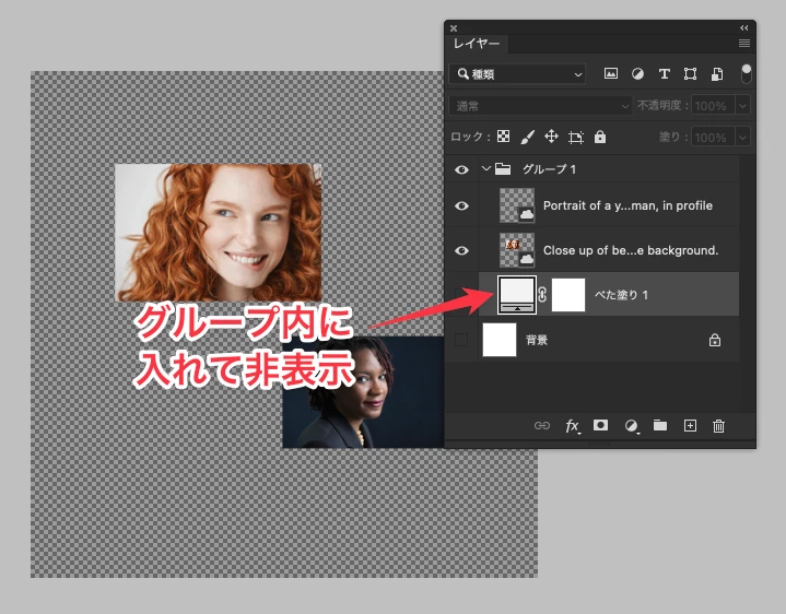 ベタ塗りレイヤーや、単に全面を塗ったレイヤーをそのグループ内に入れて非表示にしておいてください。