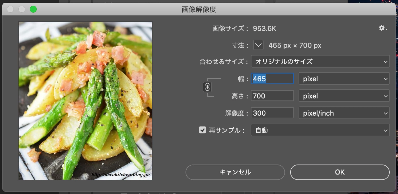 最初は直に「465ピクセル」とピクセルサイズを指定しています。解像度をいくら変えてもピクセルサイズは固定です。