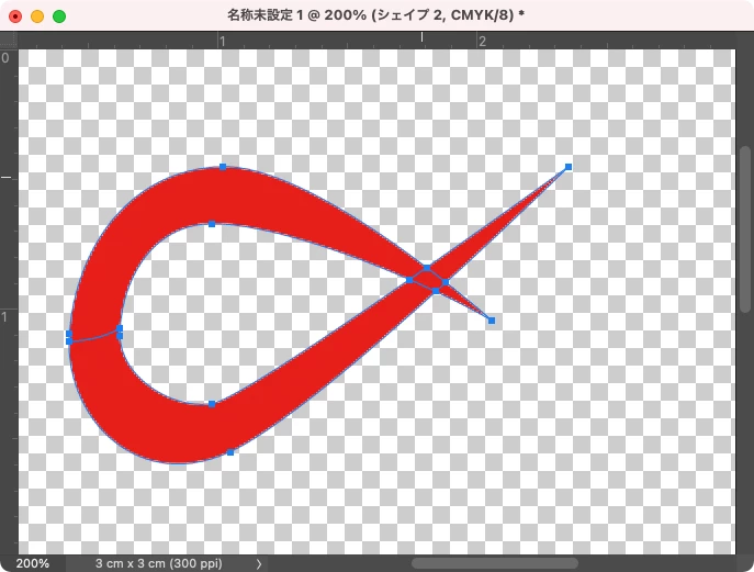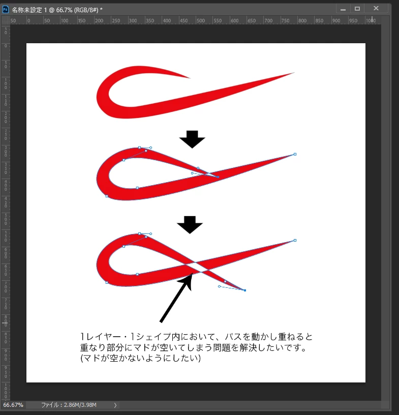 下記画像のように、ペンツールで曲線のシェイプを作成し、そのパスを編集する際、シェイプが重なる部分にマドが空いてしまいます。