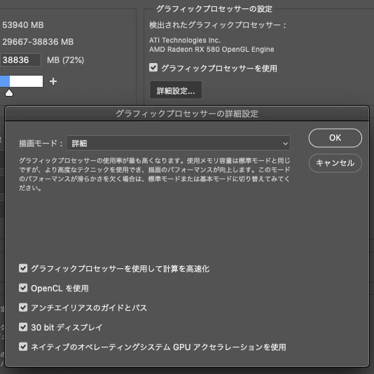 Photoshopの環境設定>パフォーマンス>グラフィックプロセッサーの設定>グラフィックプロセッサーの詳細設定で