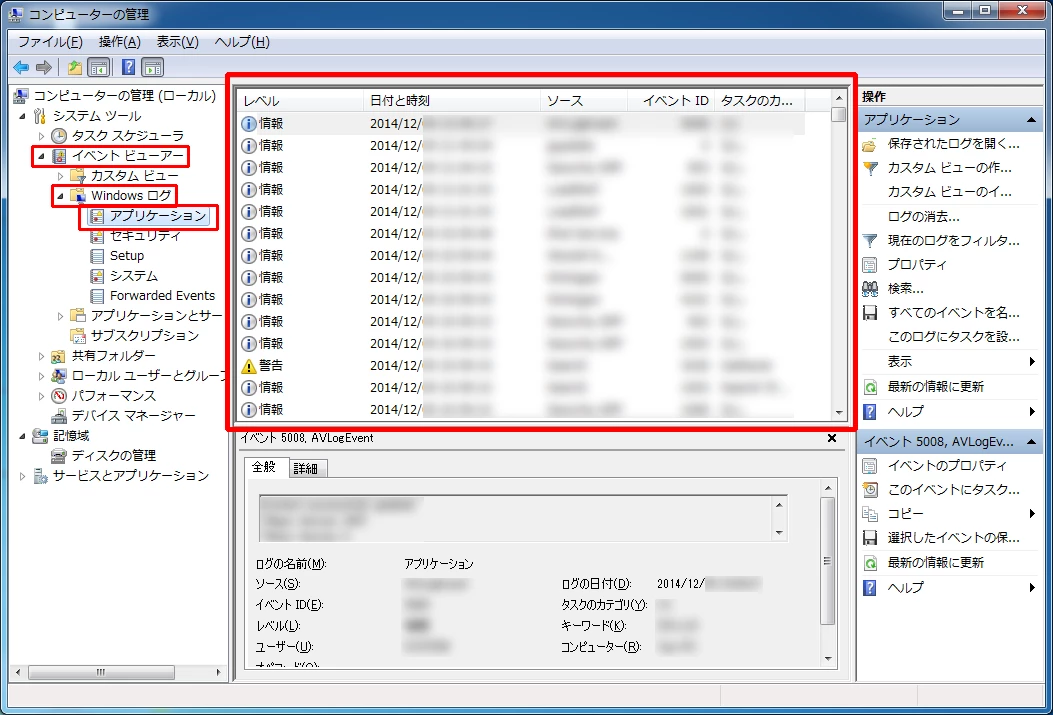 「コンピュータの管理」ウィンドウが表示されますので、ウィンドウ左ペインからツリーを展開していき、アプリケーションのログを表示させます。(白い三角右向きをクリック)
