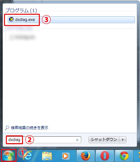 2) プログラムとファイルの検索に「dxdiag」と入力します
