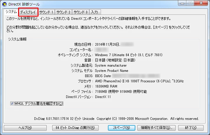 DirectX診断ツールのウィンドウが表示されますので、ディスプレイタブをクリックします。