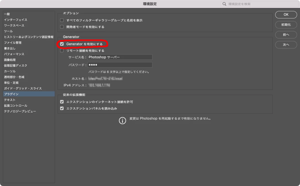 チェックが入っていない場合、チェックを入れたあとPhotoshopを再起動しましょう。