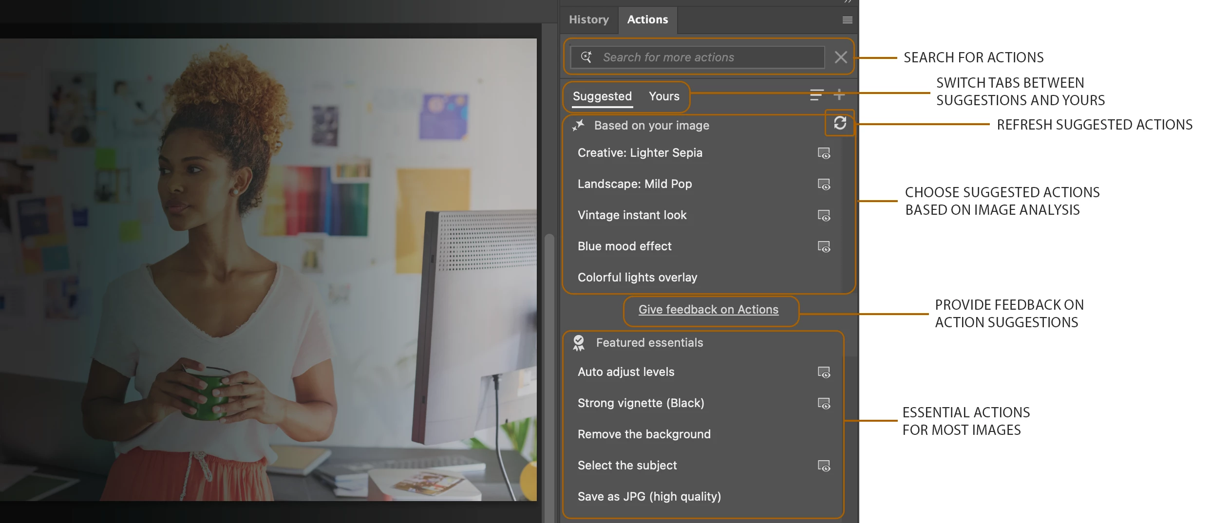 The Actions panel analyzes your image and suggests an initial 5 edits Based on your image.