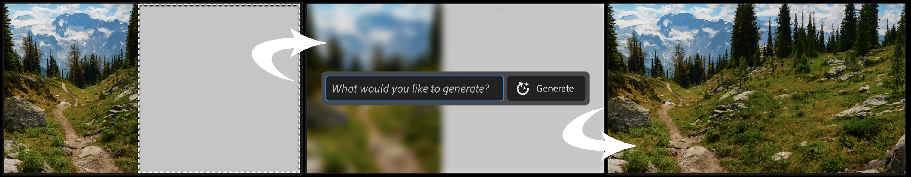 Extend images: Expand the canvas of your image, then make a selection of the empty region. Generating without a prompt will create a seamless extension of your scene.