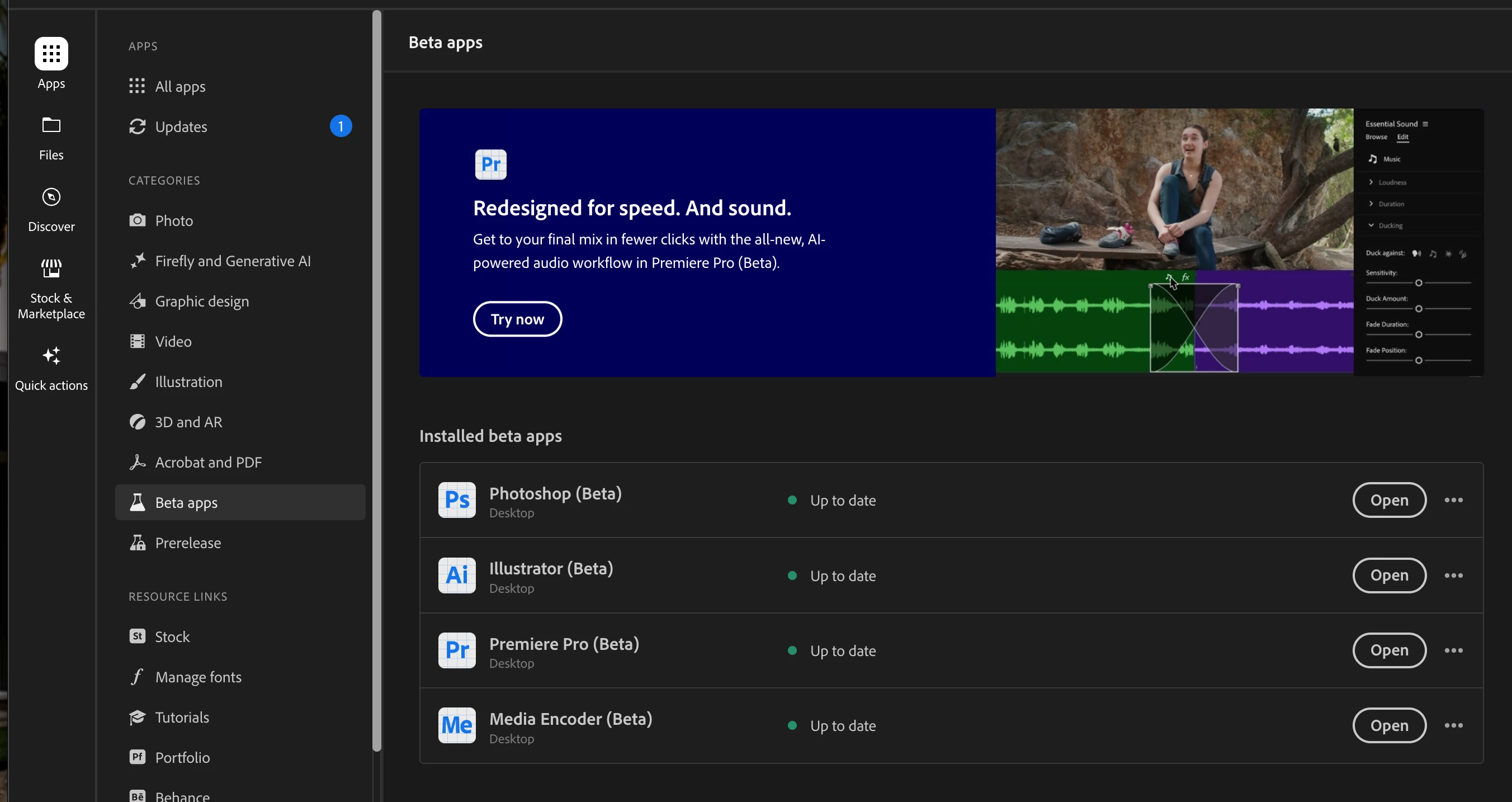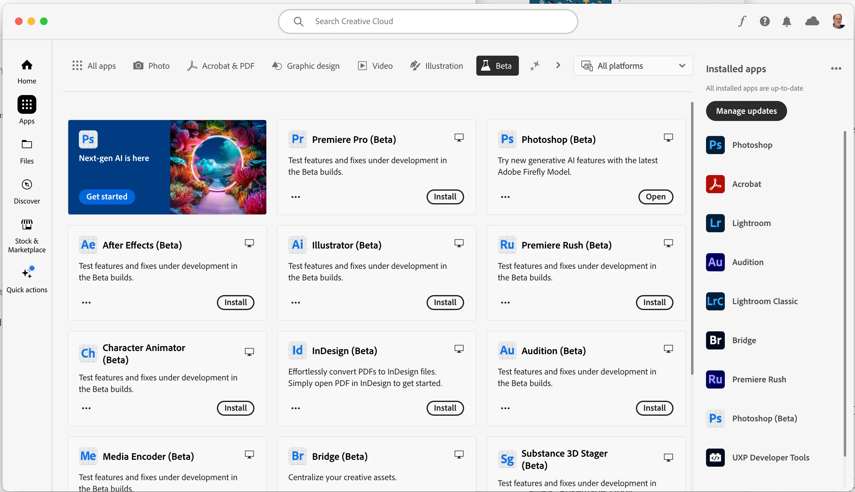@Anthony James Kulton The CC Desktop app UI has changed since 2023 - The beta apps are listed under Apps and then found in the list to the right: