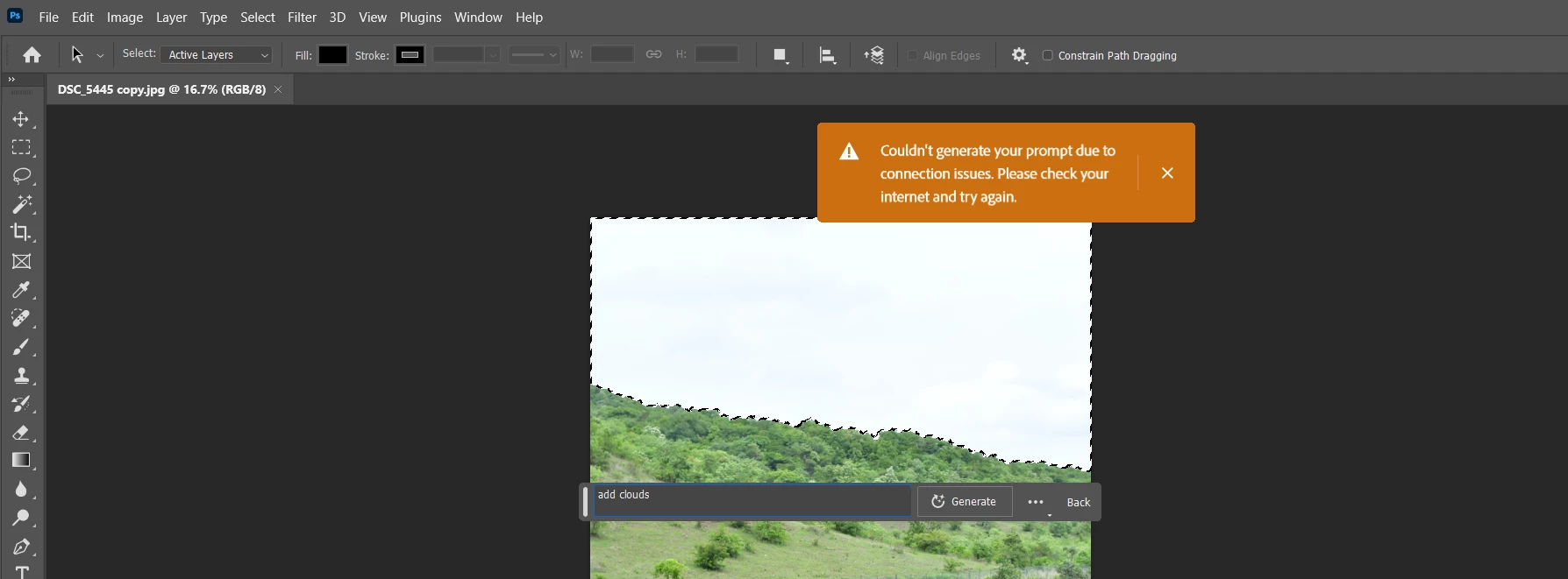not able to use generative fill, internet problem