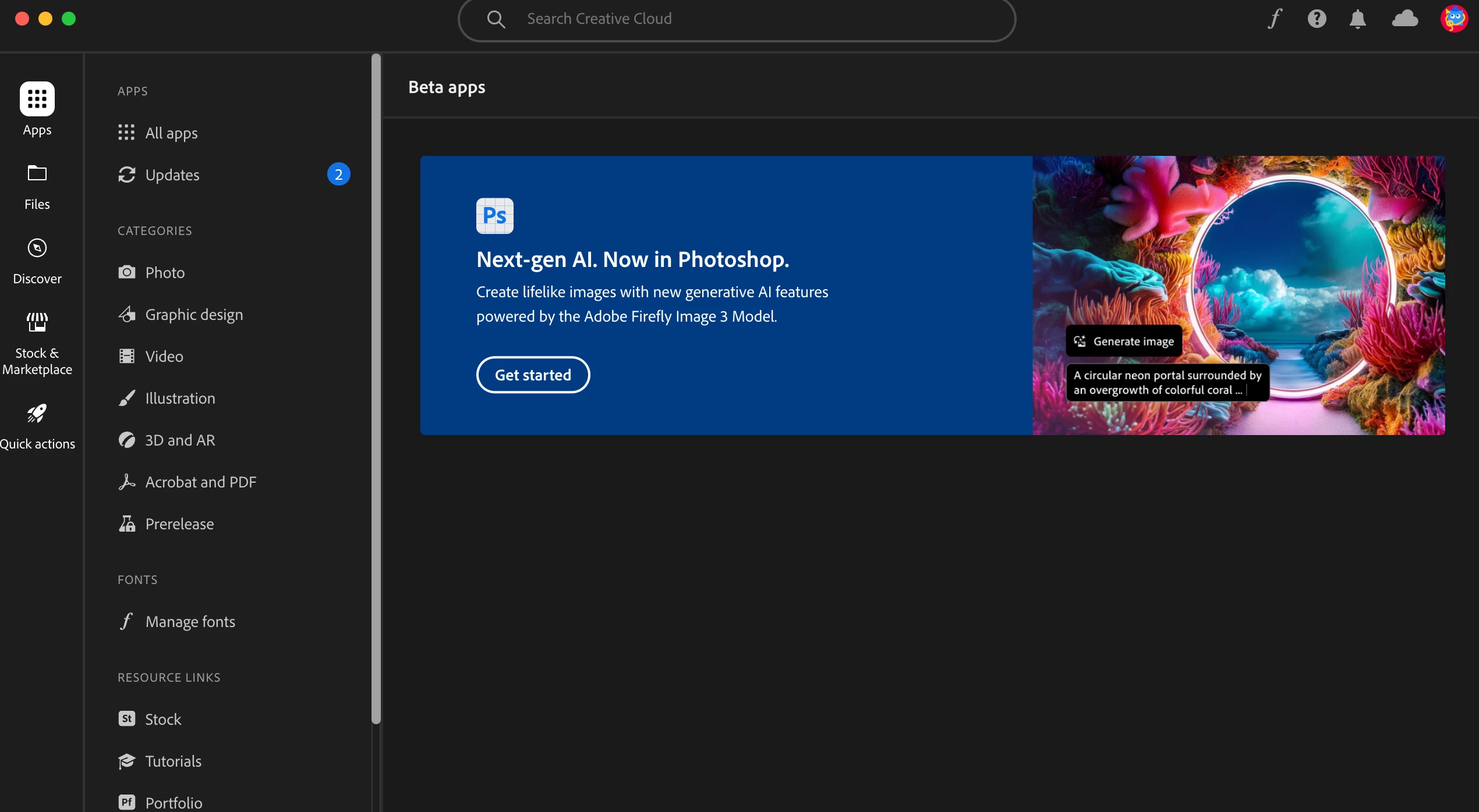 After click on Beta apps, there is Photoshop beta, but when I click on "Get started" nothing happens...