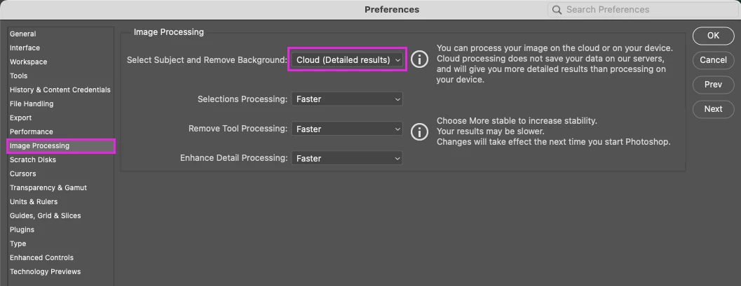 2. Wherever you access Select Subject and Remove Background in Photoshop, it will always use the cloud processing default.