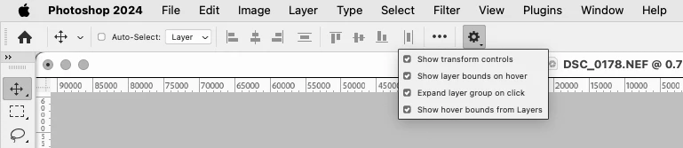 Beta version 25.9.0 no longer displays the box to toggle the display of the Move tool handles. This can only be done via the options bar cog setting. The Ctrl-T shortcut only turns the handles on, not off. This box used to be to the left of the various options. The screen caps show PS with and without that box.
