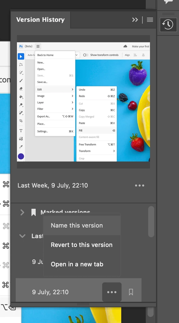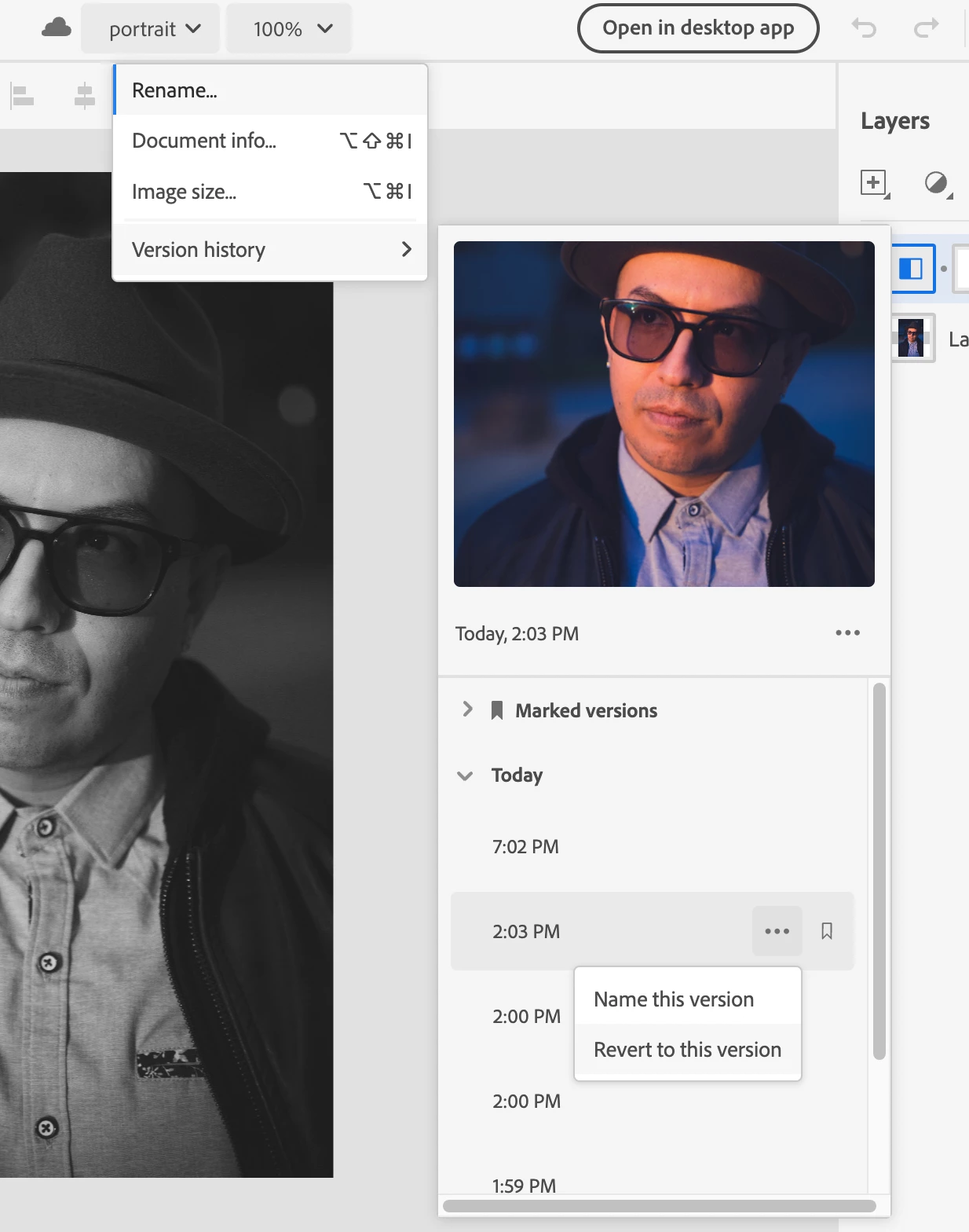 • In Photoshop on the desktop, again, you need to have the file open in Photoshop, then go to File > Version History to display a similar-looking panel to the one in Photoshop on the web: