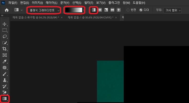• 그라디언트 도구 클릭 > 클래식 그라디언트 를 선택하고, 선형 그라디언트, 흰색에서 검정색 옵션을 선택하세요