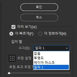 • 깊이 맵 > 소스 > 알파 1 을 선택합니다.