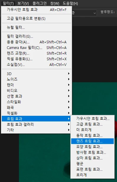 • RGB 채널 선택 후 [필터 > 흐림 효과 > 렌즈 흐림 효과]를 선택합니다.