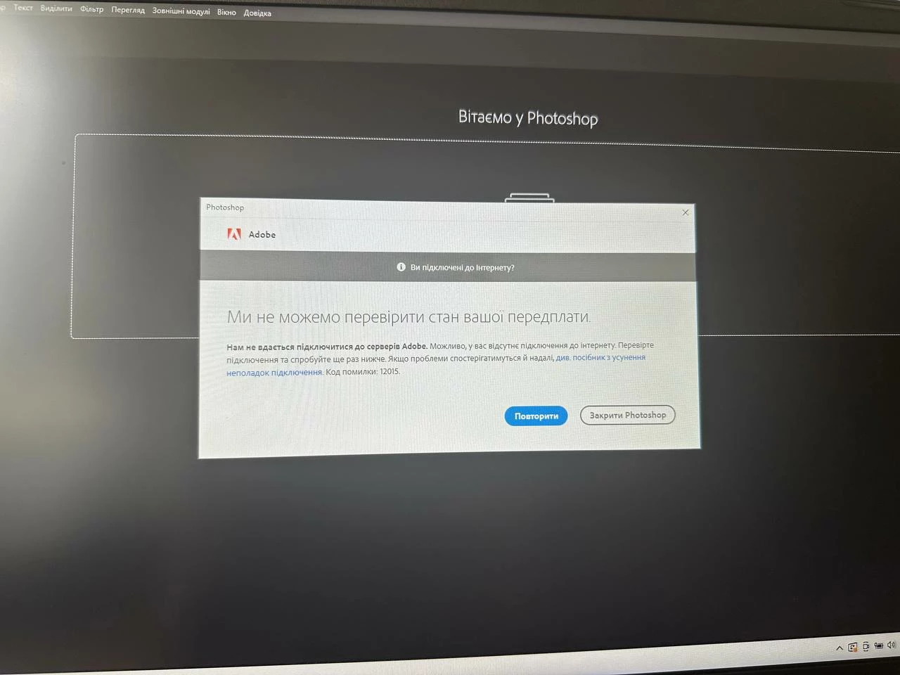 При вході в фотошоп пише, що не може перевірити стасус підписки!