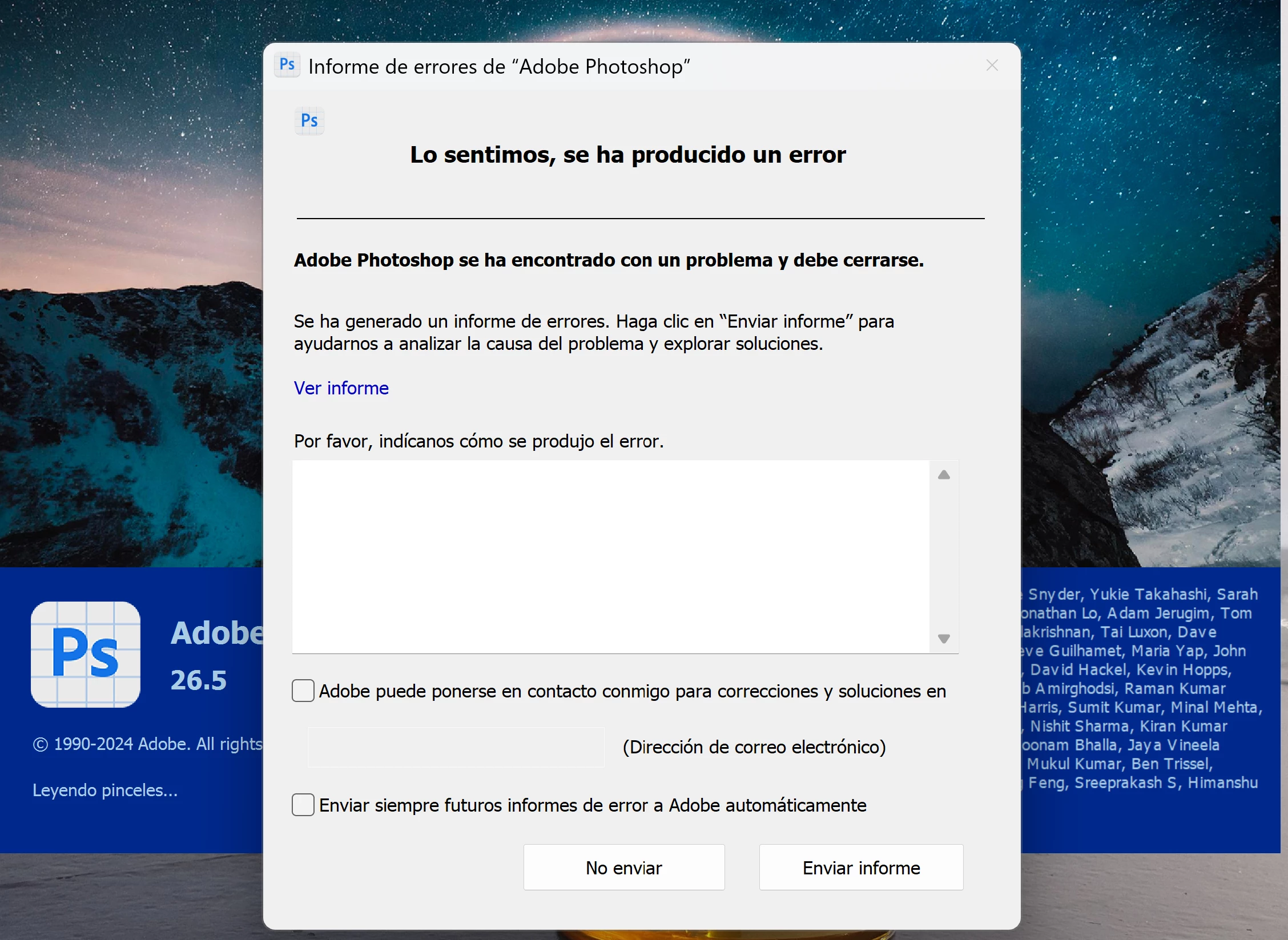 Pues eso, cuando inteto abrir Photoshop Beta 26.5, al intentar cargar lo pinceles, sse queda el mensaje de "Leyendo pinceles" y salta el cartelito de informar del error.