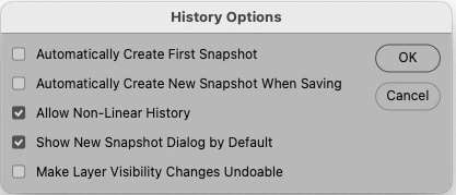 A problem with the History Panel. When I Open History Options and check “Show New Snapshot Dialog by Default”, this function does not work, I do not get a New Snapshot Dialog. See attached screen shot. Suggestions welcome.