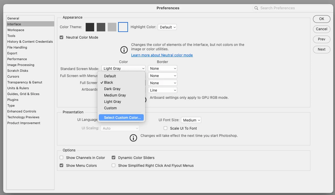 Not able to select a custom color in the preferences / interface window Photoshop 2025