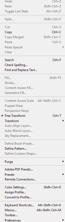 Free Transform in the Edit menu is always checkmarked like it's in use, even when I am not transforming anything. I can be doing anything in Photoshop, and it always stays checked as if in use.