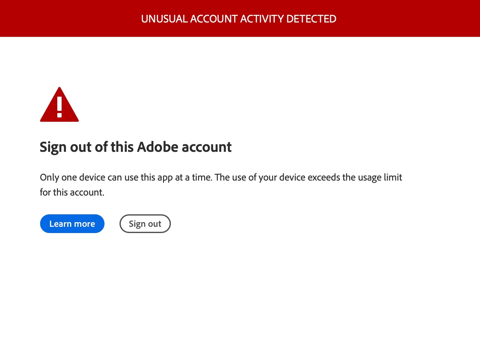My partner is getting this modal popup blocking her activity in Photoshop v 25.5—but not in any other CC apps. It feels like a phishing scam, but could just be a bad design. She didn't follow the links (Learn more and Sign out) in the modal. She has deactivated access on other machines, and deleted and reinstalled Photoshop. The message still appears.