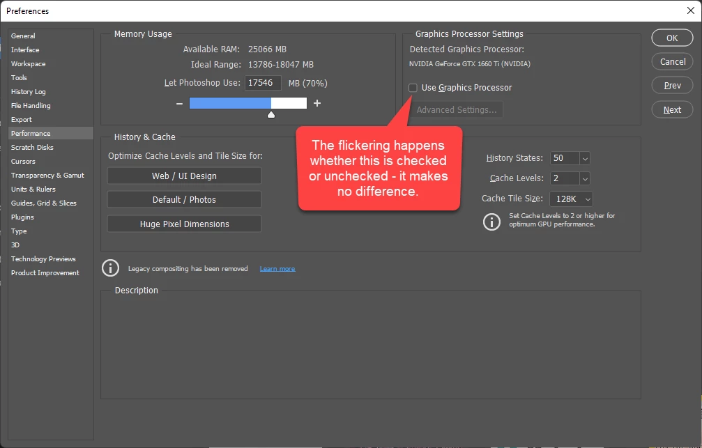 but the flickering still happens even if I've unchecked "Use graphics processor":
